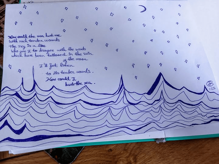 Vivir en el mar no es exactamente mi sueño, pero, tal y como yo lo veo, es una buena metáfora de las ganas que tengo de completar mis proyectos. Además, siempre me ha fascinado el cielo nocturno, así que esta pequeña «ilustración» me salió de forma natural. Quizá solo quería crear algo sencillo, incluso “feo”, pero que tuviera un significado positivo para mí. Por eso siempre digo que los pacientes no necesitan tener grandes habilidades artísticas: lo importante es comprometerse con uno mismo y con sus objetivos.