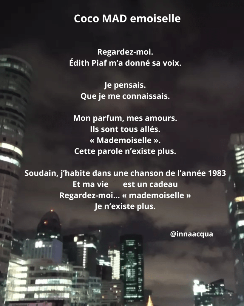 Mon parfum, mes amours. Ils sont tous allés. « Mademoiselle ». Cette parole n’existe plus.